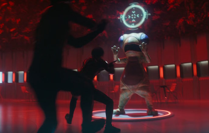 „Keine Bewegung, Sir! Und behalten Sie Ihre holografische Zielscheibe da, wo ich sie sehen kann!“ – Oh, ein richtiges Ma(r)skottchen: Das hier ist nur eine Art „Counter Strike“, um die 60-jährigen Gamer des Jahres 1999 abzuholen.