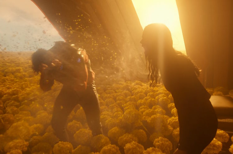 Doch beim Bumsen unter der Makroeinstellung der Kameralinse (= ihr wisst schon: Haut, Augen, mehr Haut) passiert etwas ganz Wunderschönes: Tarima bringt unseren Caleb mit einer Betazoid-“Mind Melt“ an einen wunderschönen, 3D-projektionsgeeigneten Ort: Eine Wiese mit endlosen gelben Blumen. Dies ist ihr mentaler Spack… äh… Safe Space, wo Gedanken nur deswegen so frei sind, weil keine phantasievollere Landschaftsdarstellung ihre Ausbreitung verhindert?
